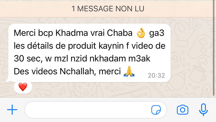 Merci bcp Khadma vrai Chaba 👌 ga3 les détails ​de produit kaynin f video de 30 sec, w mzl nzid ​nkhadam m3ak Des videos Nchallah, merci 🙏