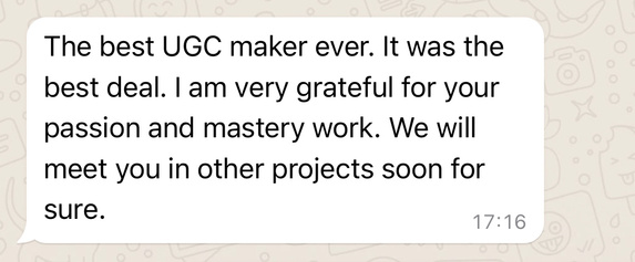 The best UGC maker ever. It was the best deal. I am very grateful for your passion and mastery work. We will meet you in other projects soon for sure.